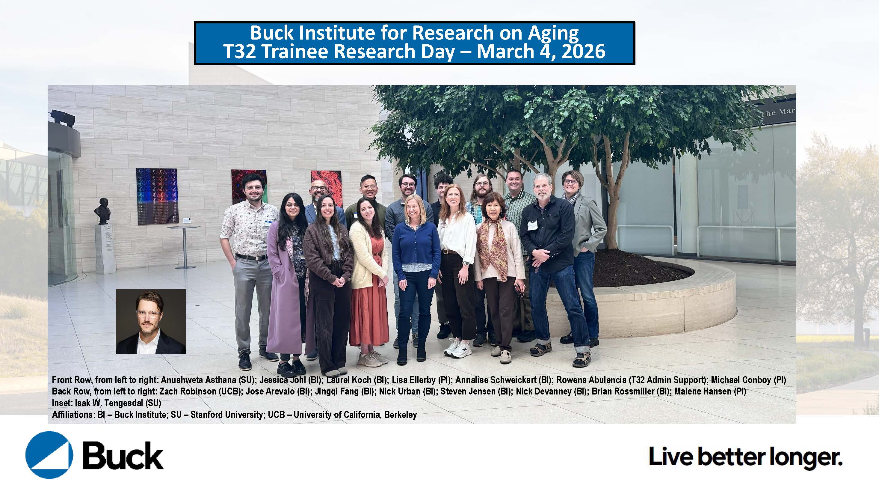 The Buck Institute marked its annual T32 Trainee Research Day on March 4, 2026. This training grant, led by Professors Lisa Ellerby and the late Judy Campisi, boasts a 26-year history. Since 1998, the Buck Institute has received the grant, aiding in the training of postdoctoral scientists nominated by mentors across 32 laboratories spanning the Buck Institute for Research on Aging, UC Berkeley, Stanford University, and Lawrence Berkeley National Laboratory.