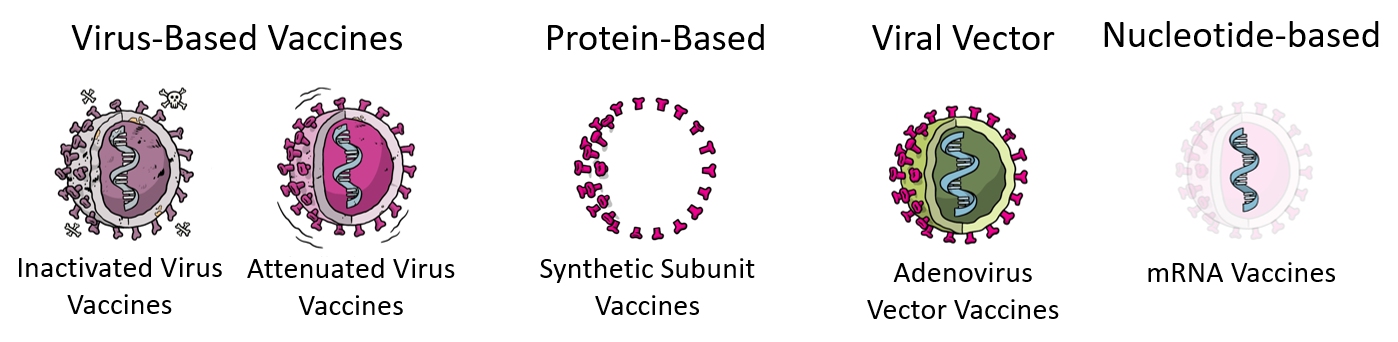 There are four main types of vaccines (summarized in Table 1). Two of them are most familiar to us: the virus vaccines like the flu vaccine and the measles/mumps vaccine; and the protein-based vaccines like the whooping cough/tetanus vaccine. These vaccines have been around since the mid-20th century. The two other types of vaccines, the viral vector and mRNA vaccine, were more recently developed in the 1970s-1980s and are getting more publicity due to the current pandemic. By now, you’ve probably heard of at least one of the COVID-19 vaccines being distributed where you live, and the goal of this blog is to inform you about what these vaccines are, how they work, and the process of how they were developed.